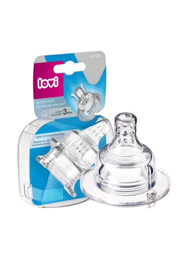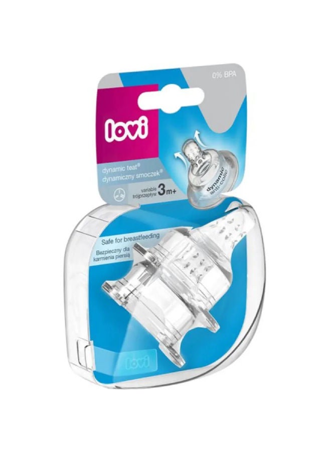 Made from heterogeneous layers of silicone during feeding, Lovi’s dynamic teat modifies its shape (lengthening), adapts to the rhythm and strength of the baby’s sucking, similar to the mother’s breast when breastfeeding. The system of internal holes formed according to the model of lactation ducts regulates (slows down) the flow of food and stimulates the child to actively suck. It allows to combine breastfeeding and feeding from a bottle.