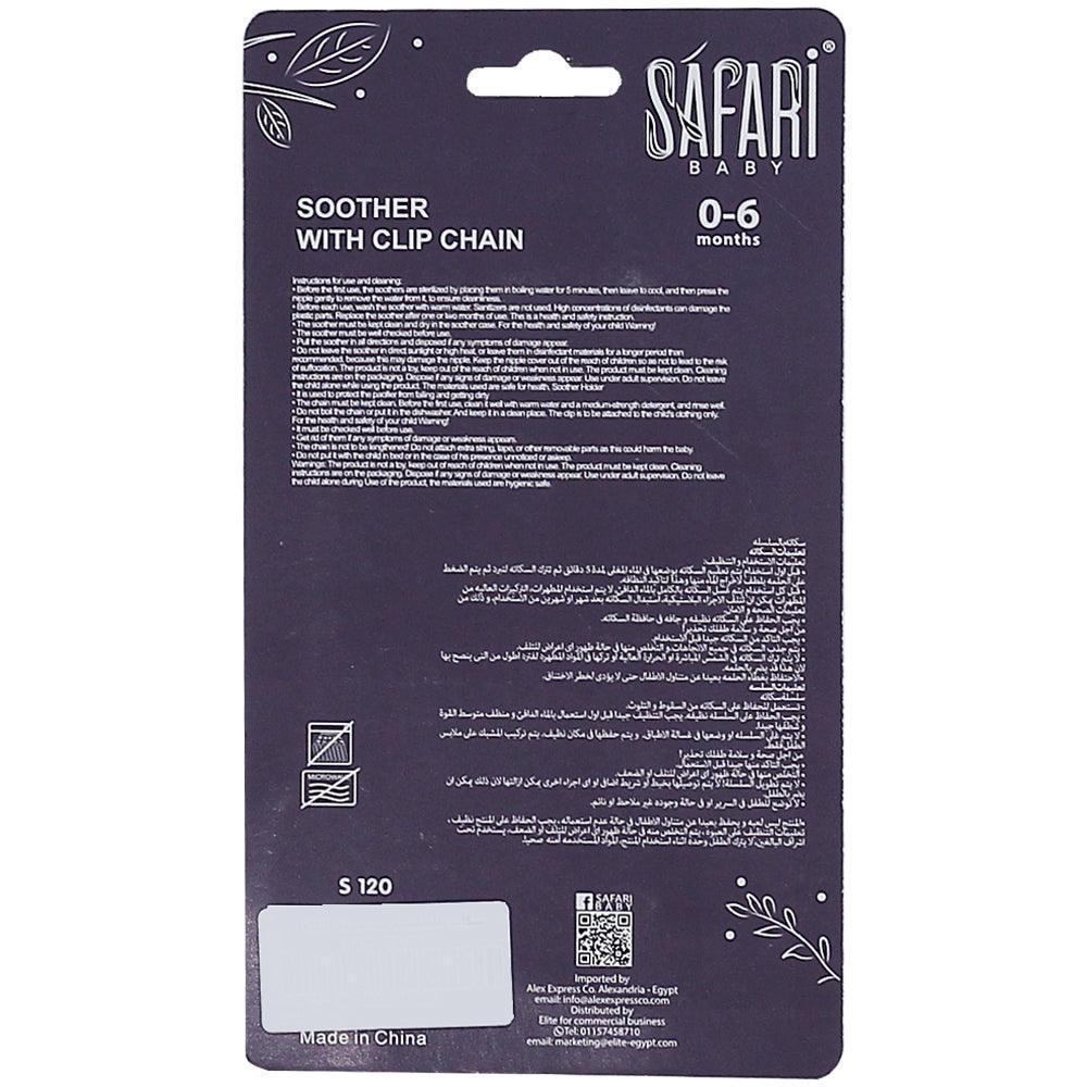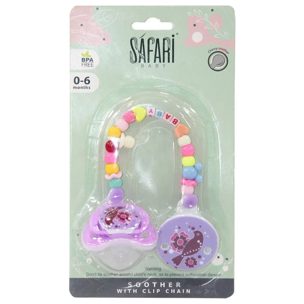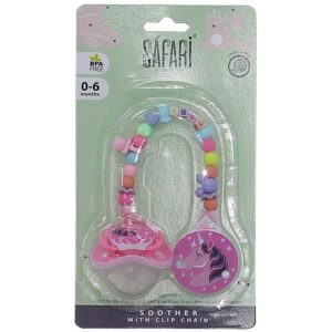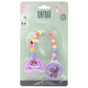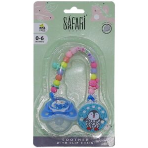 Baby soother and chain from safari baby is one of the most important tools that help the mother to keep her baby quite, the pacifier can be installed in any of its belongings to avoid losing.