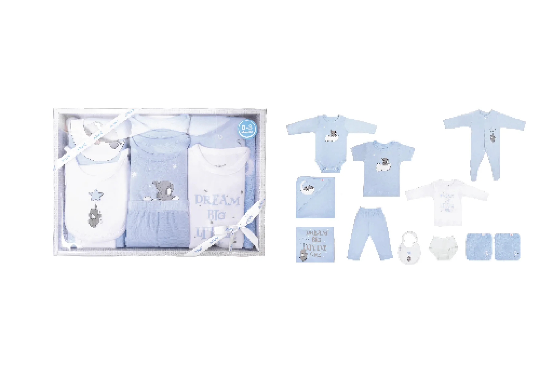 Includes 10 matching essentials → bodysuits, pants, bibs, mittens, hats, and more