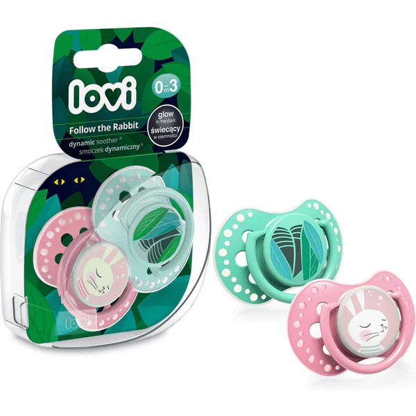Specifically designed, the dynamic structure of the Lovi pacifier: Does not disrupt the natural sucking reflex, Prevents the reflex of biting the pacifier, Ensures free breathing and swallowing of saliva, Does not interfere with proper speech and bite development. The set includes: Lovi pacifier 2 pcs. size 6-18m, Pacifier cover 2 pcs. Capsule for hygienic storage of pacifiers.