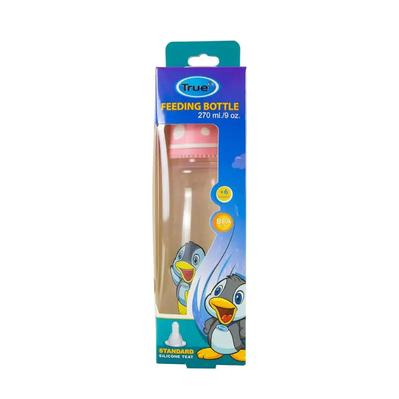 زجاجة رضاعة بلاستيكية شفافة بسعة 270 مل تحتوي الزجاجة على صمام مضاد للمغص يمنع ابتلاع الهواء أثناء الرضاعة.